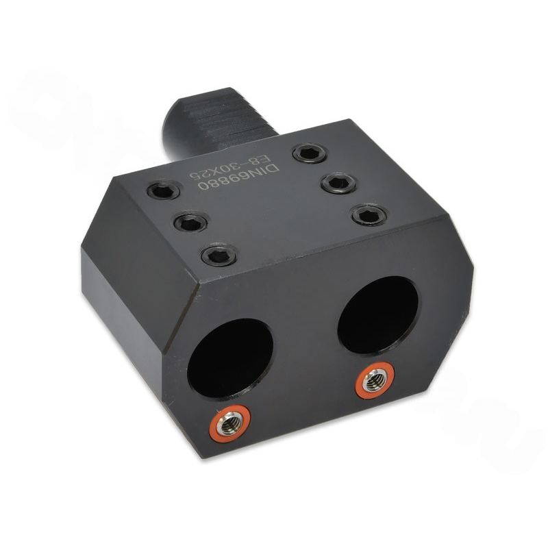 Двойная резцедержка под цилиндрический хвостовик типа VDI E8 предназначена для крепления расточных резцов с диаметром хвостовика в 25 мм. Она имеет размер хвостовика оправки VDI30. Блок VDI в основном применяется для установки расточных резцов и прочего осевого инструмента, требующего наружного подачи охлаждающей жидкости.